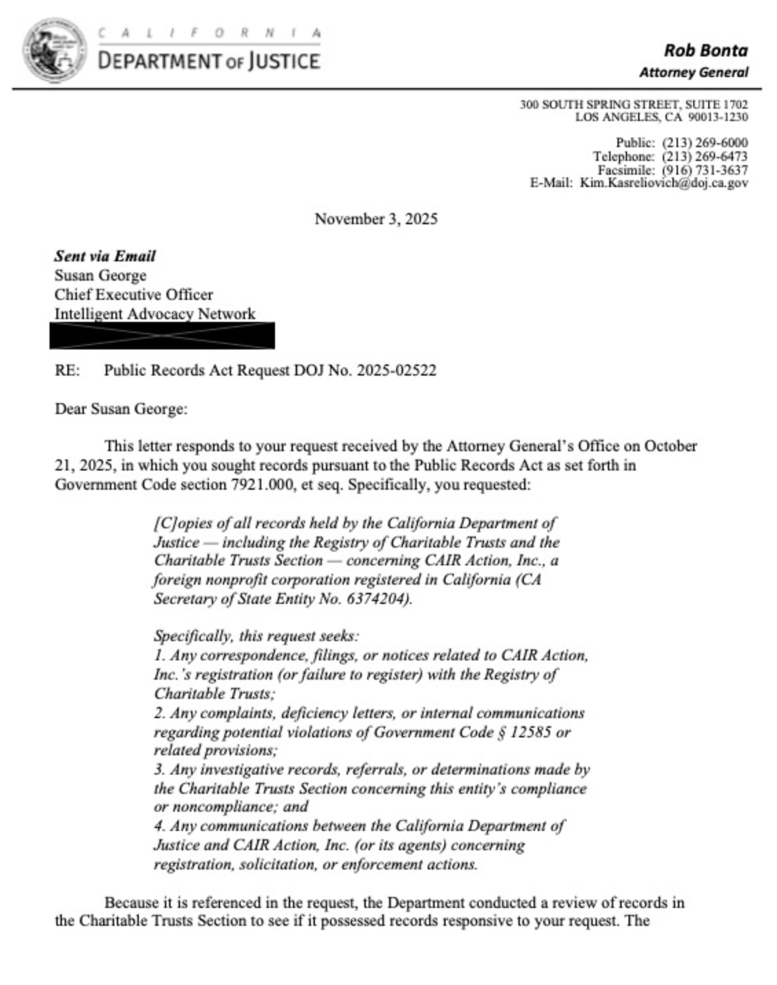 Even in California—one of CAIR's largest and most active hubs—CAIR Action is only registered as an out-of-state nonprofit corporation, the report states. It is not registered with the California Attorney General's Registry of Charitable Trusts, as is required within 60 days of fundraising in the state, and has not filed the CT-1 form necessary for any charitable organization to operate. In fact, CAIR Action "has received no authorization to solicit funds," according to a Nov. 3 letter from the California Attorney General's office contained in the NCRI report.