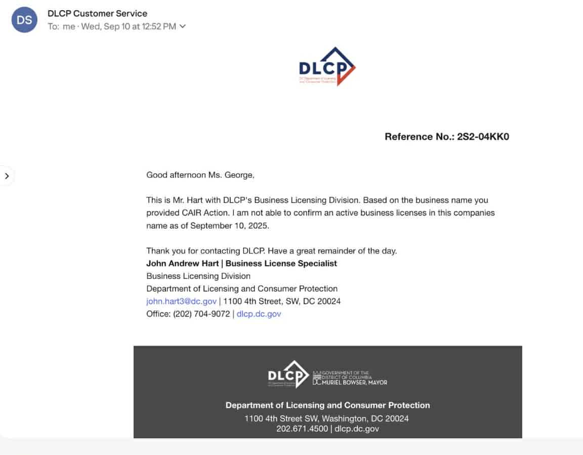The report shows that the D.C. Department of Licensing and Consumer Protection could not locate CAIR Action's Basic Business License when contacted by NCRI investigators in September and October.