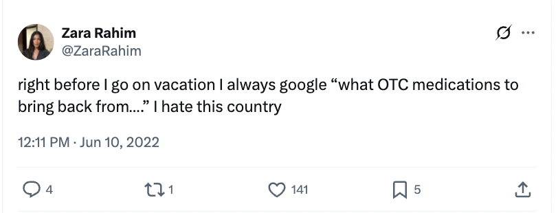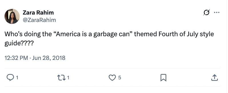 "Who’s doing the 'America is a garbage can' themed Fourth of July style guide????" she asked in June 2018. On a similar note, she posted "I hate this country" after asking which prescription drugs she could buy over the counter abroad.