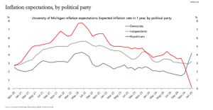 Yet there’s another set of "expectations" at play, and those are partisan political ones. Surveys have shown a stark partisan split in inflation expectations. There’s a chart from Apollo’s Torsten Slok back in January 2025 that illustrates how the expectations changed after the election results.