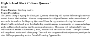 Another Minneapolis public school, Roosevelt High School, offers one of the two courses, according to a course catalog, which states the course is "for Black girls (Queens)" who "will explore different topics relevant to their lives as Black students." The girls, designated as "Queens," will "build a sisterhood" and, among other goals, "learn about creating healthy, positive relationships" over the year-long course.
