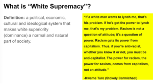 Other sections explore why "black lives matter," and claim white people in the United States "are the dominant group that profits and benefits from race and racism." One slide quotes Stokely Carmichael, a former Black Panther Party leader who has praised Adolf Hitler, saying, "Racism gets its power from capitalism. Thus, if you’re anti-racist, whether you know it or not, you must be anti-capitalist."