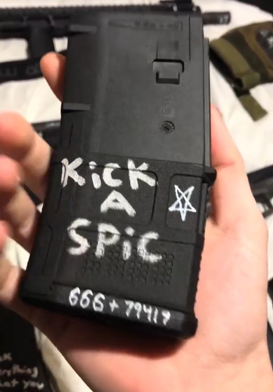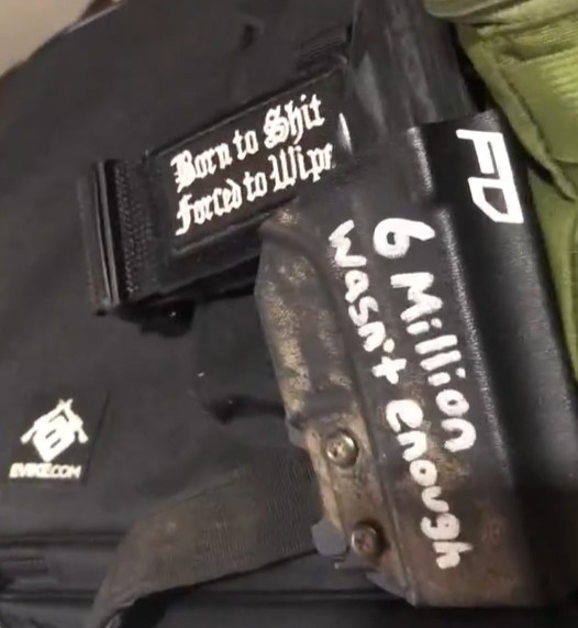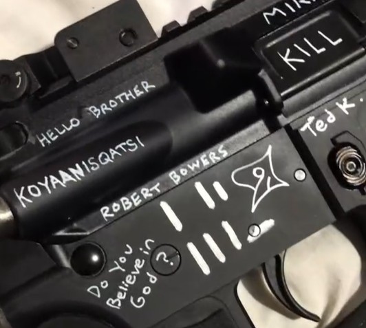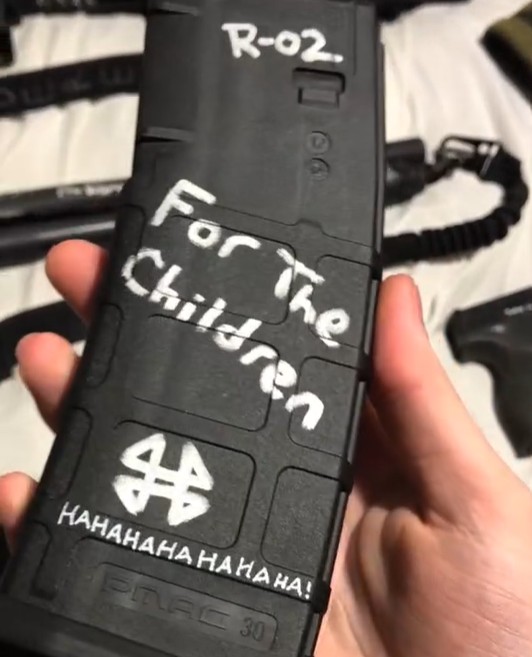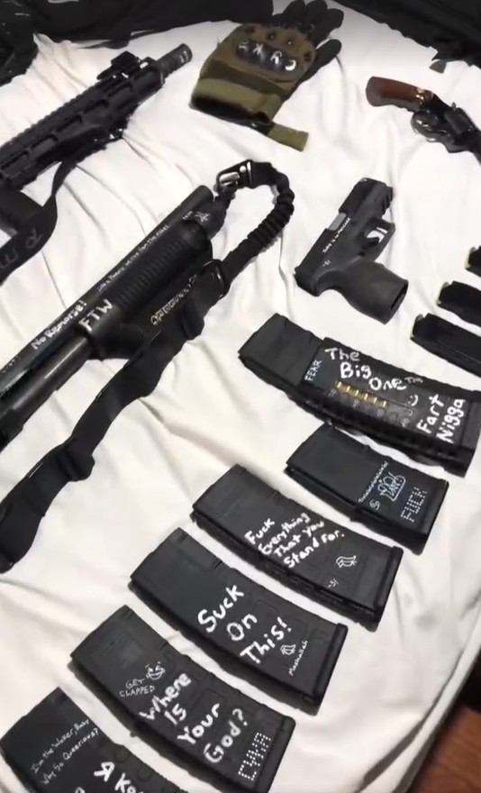 The video also showed the names of several notorious mass shooters inscribed on various bits of paraphernalia. Among those were Norwegian neo-Nazi Anders Breivik and Tree of Life synagogue shooter Robert Bowers.
