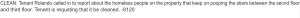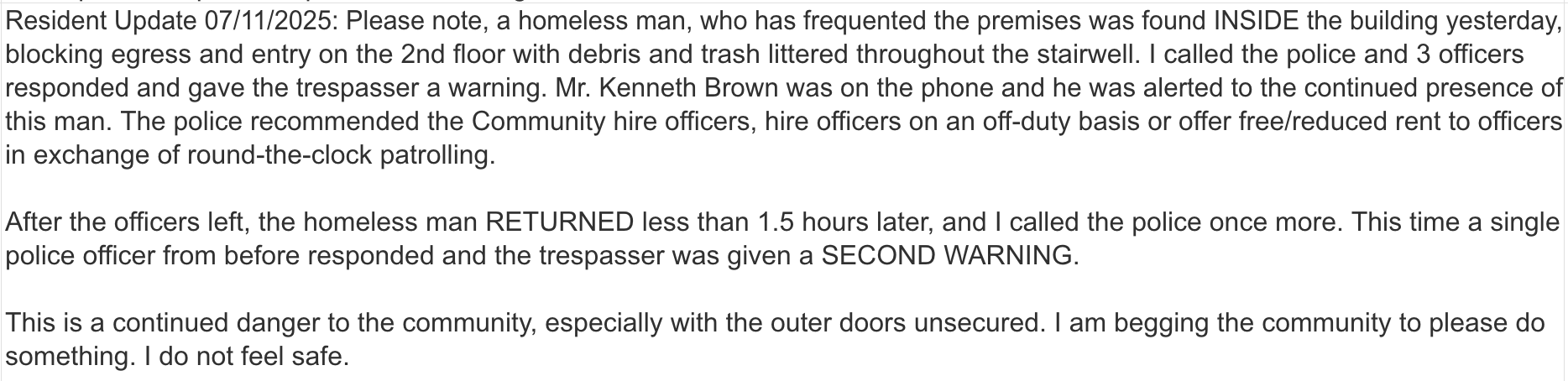 "This time a single officer from before responded and the trespasser was given a SECOND WARNING," the tenant wrote in a note to management. "I am begging the community to please do something. I do not feel safe."
