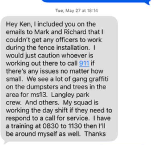 "We see a lot of gang graffiti on the dumpsters and trees in the area for ms13," a police sergeant texted Brown, who had inquired about off-duty patrols in May at the request of a contractor. "I would just caution whoever is working there to call 911 if there’s any issues."