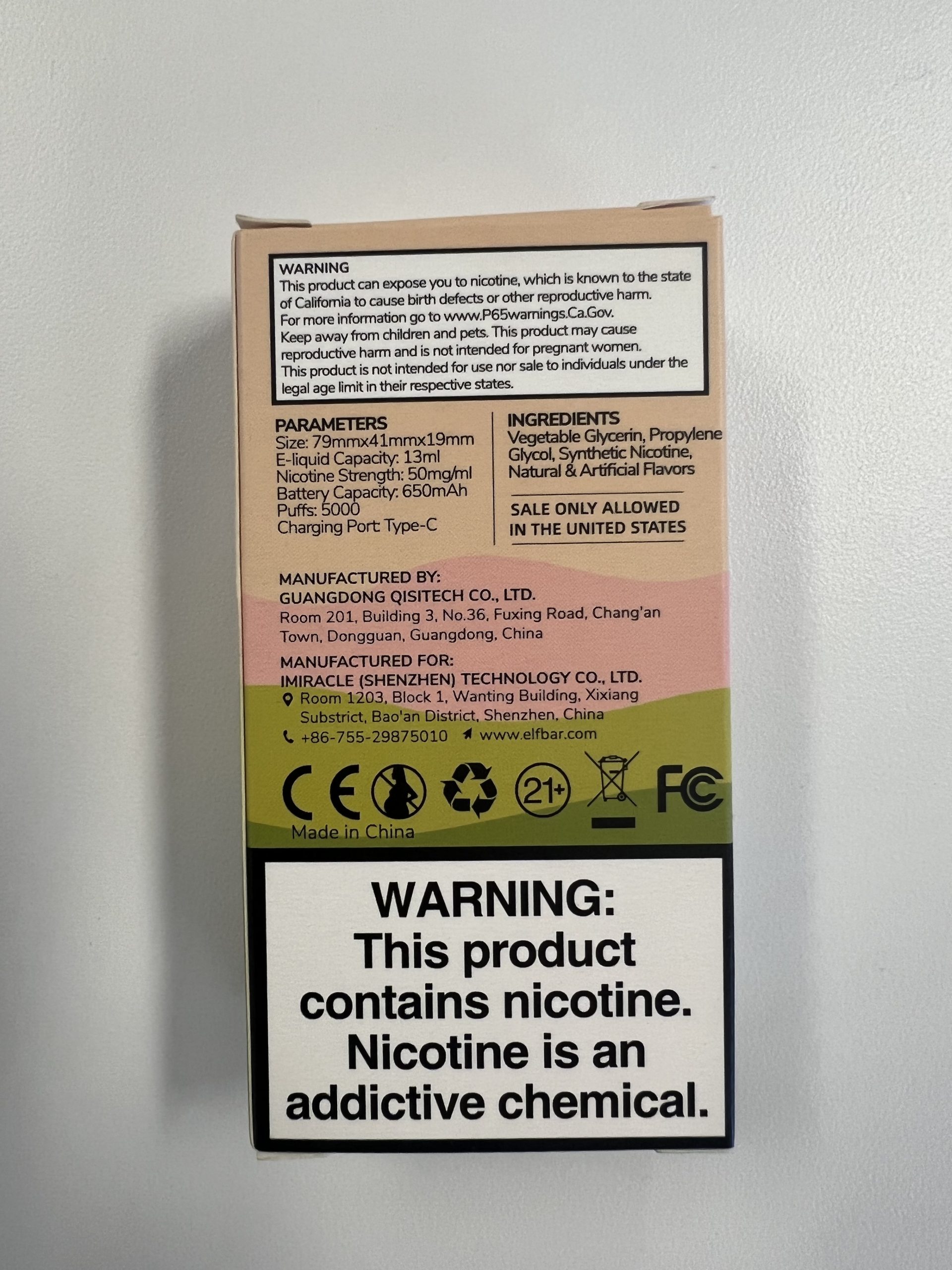 The Elfbar purchased by the Free Beacon on Thursday was manufactured in China specifically for sale in the United States, according to a disclosure on the product's box.