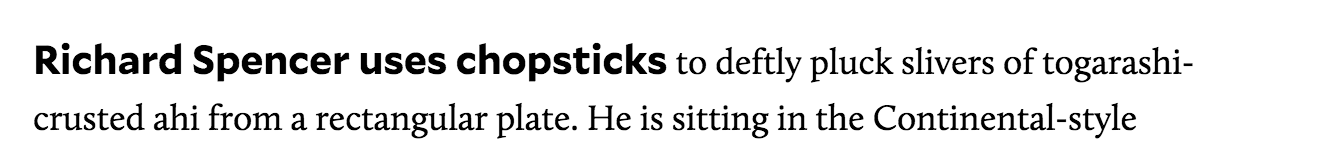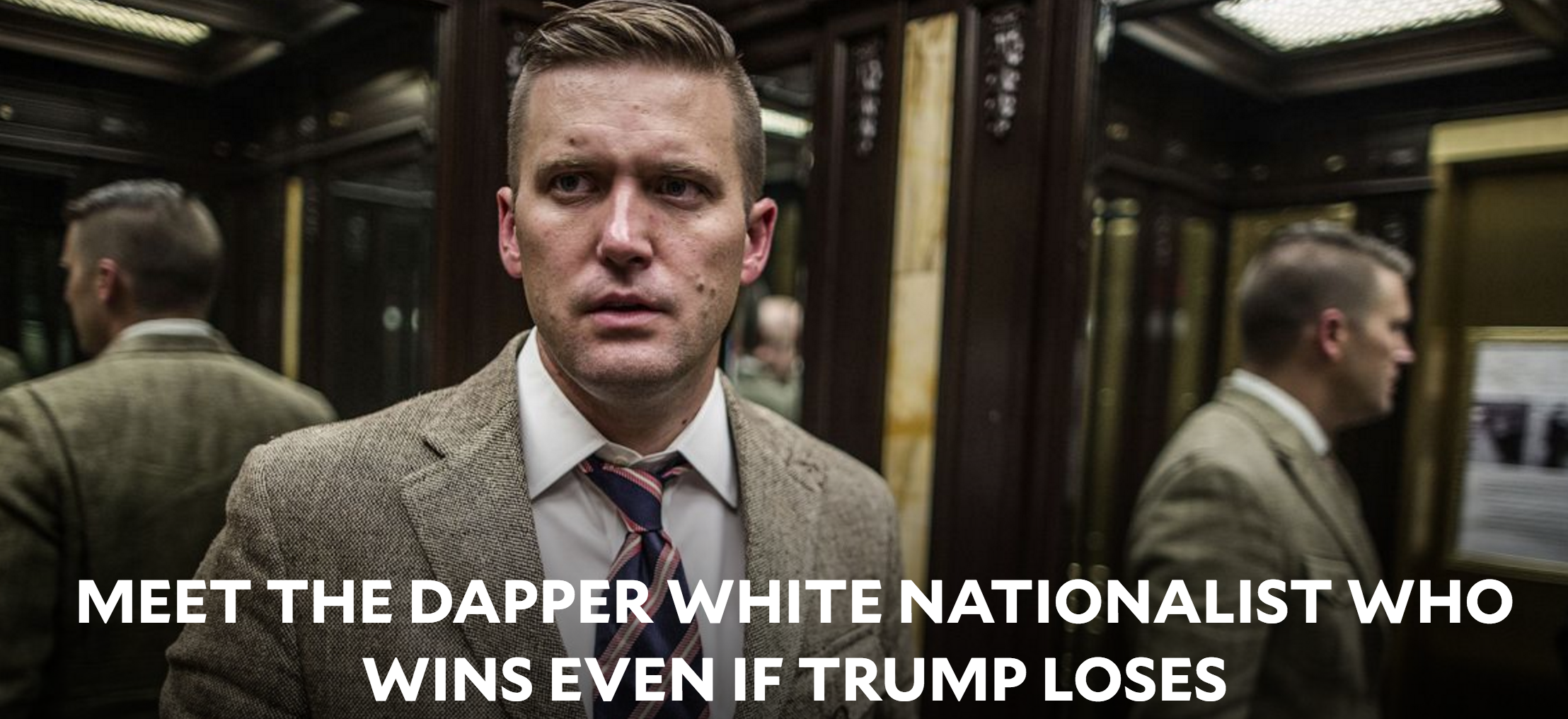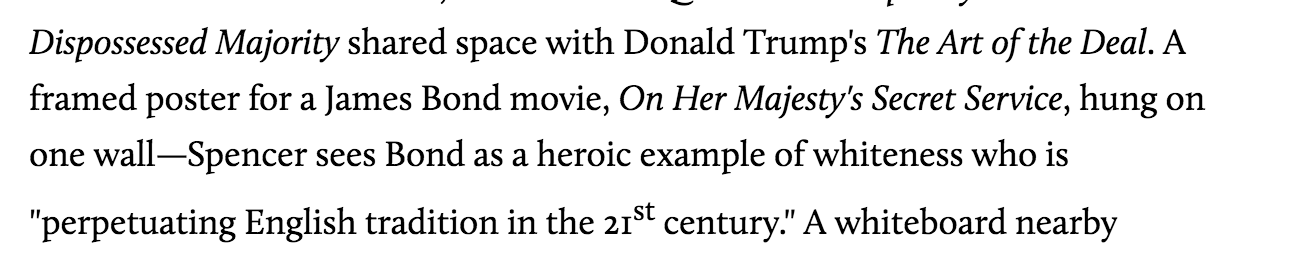 Richard Spencer lives in his parents' house in Wyoming, where he worships the rocks and stones. Occasionally he comes to Washington, D.C., to discuss the inferiority of black people with fellow dorks he has met on the Internet. For some reason, there is a very long profile of him in Mother Jones, one of the dumbest, least necessary pieces of journalism I have ever read.