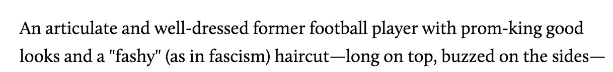 3) They also—yes, I know, this is getting sort of one-note, isn't it?—think he is "articulate" and has "prom-king good looks"