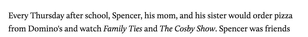 Spencer: Oh, you know, we watched The Cosby Show and ate pizza.