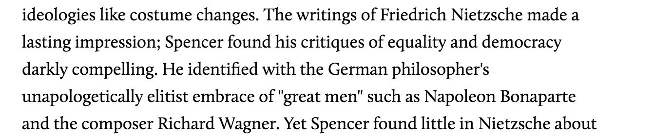 6) He managed to attend some very good schools—UVA, Chicago—without understanding Nietzsche, who hated racism and changed his mind about Wagner at, uhh, book-length