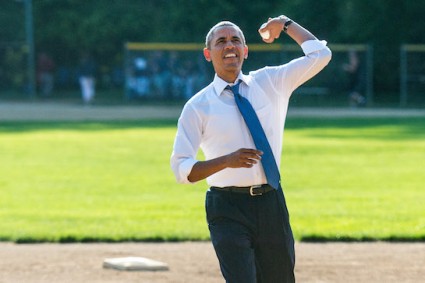 Obama’s lack of basic motor skills was on display Monday evening at a Little League game in Washington, D.C. He looked like he was trying to shot put a hacky sack, or something.