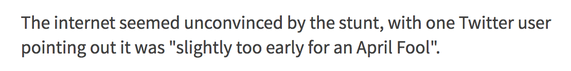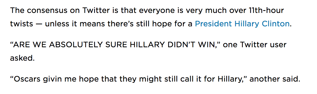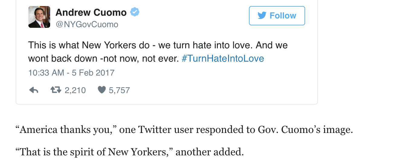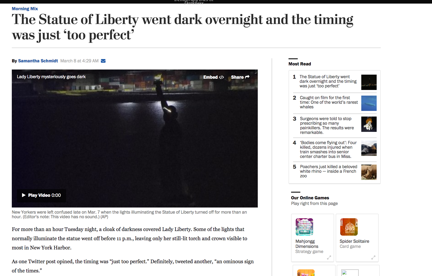 Let me get this straight: a Twitter user, whose handle you don't even bother to name, posted on Twitter. And another person, also unidentified, "tweeted." This is the definition of fake news. How hard would it have been, with all the resources at your command, to have called someone—anyone—in New York and asked about what happened with the statue? "Joe Ladders, 31, also noticed the strange occurrence. 'Bla, bla, bla, I am answering a journalistic query,' said Ladders." You might have had to make three or four phone calls until you found someone to make your lame point about Drumpf, but trust me, it wouldn't be difficult.