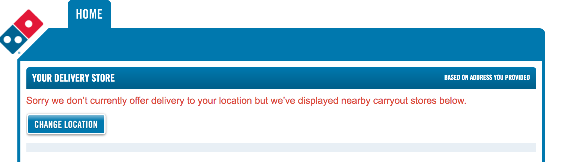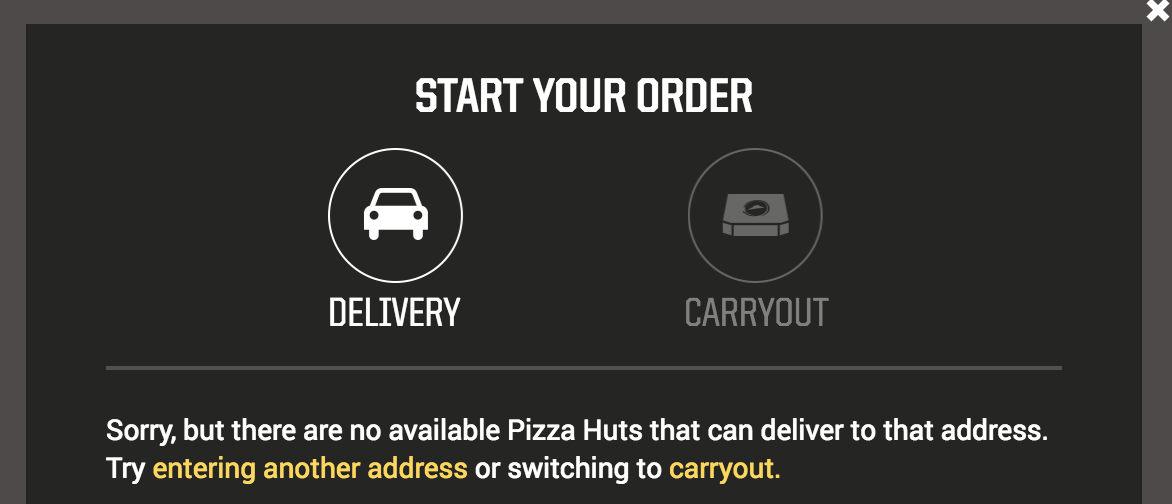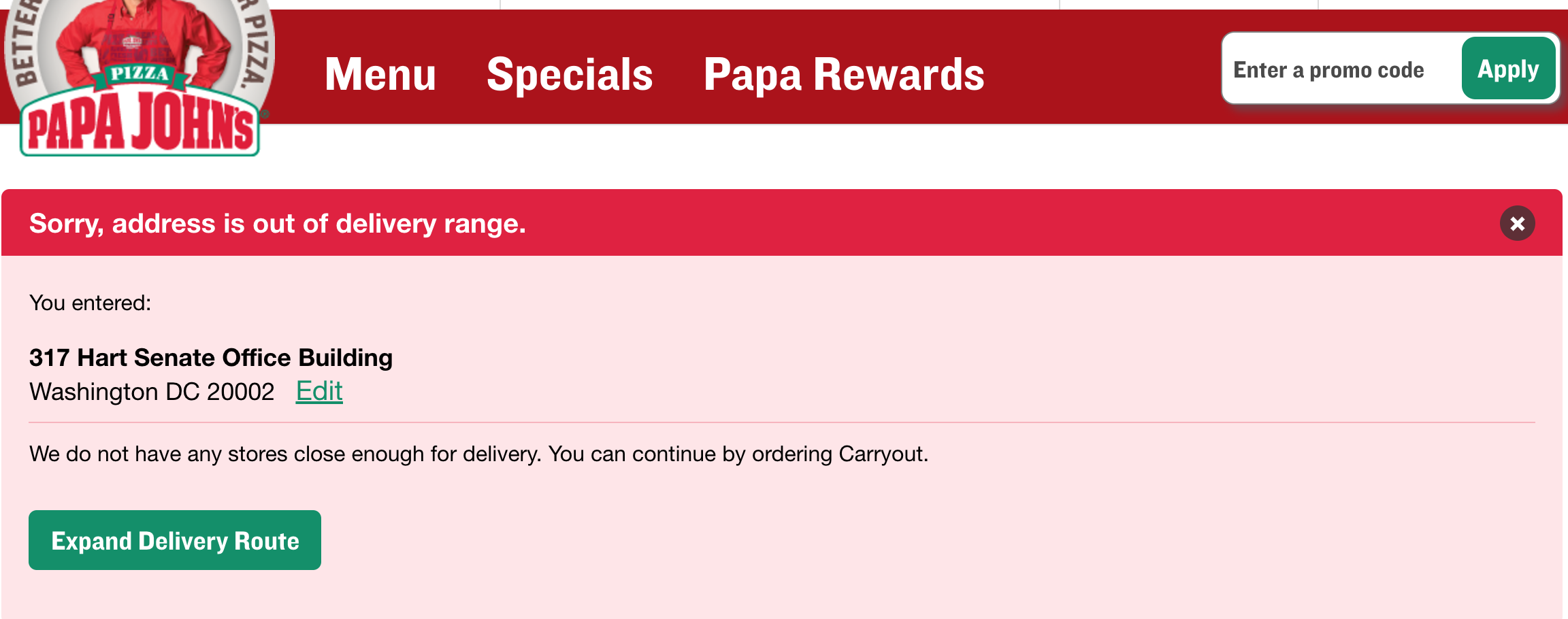 Unfortunately, that didn't pan out. Papa John's, Domino's, and Pizza Hut all told me that they did not deliver to the Hart Senate Office Building.