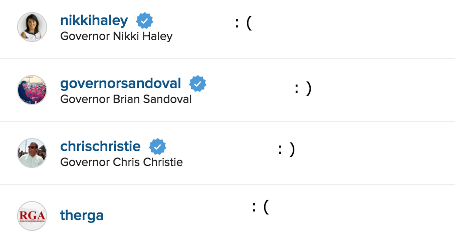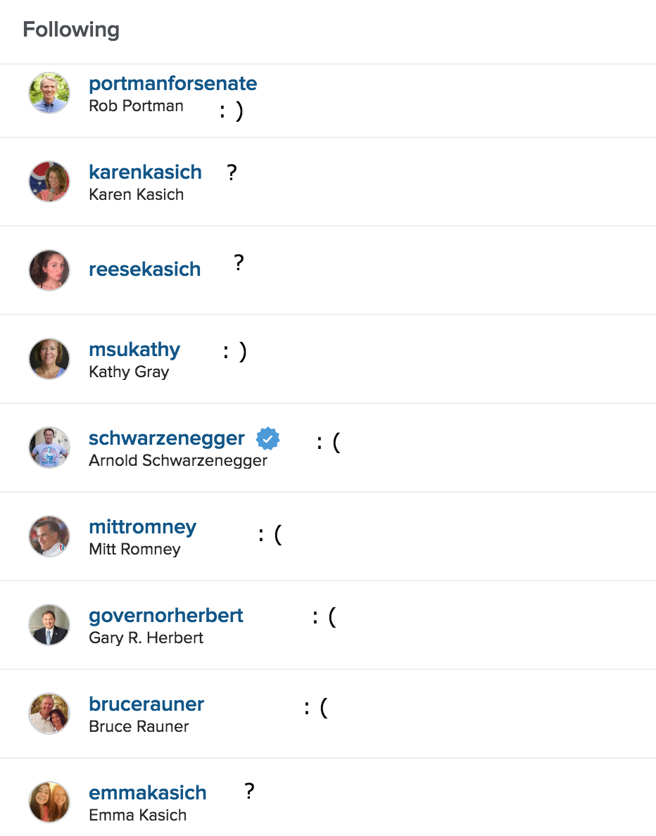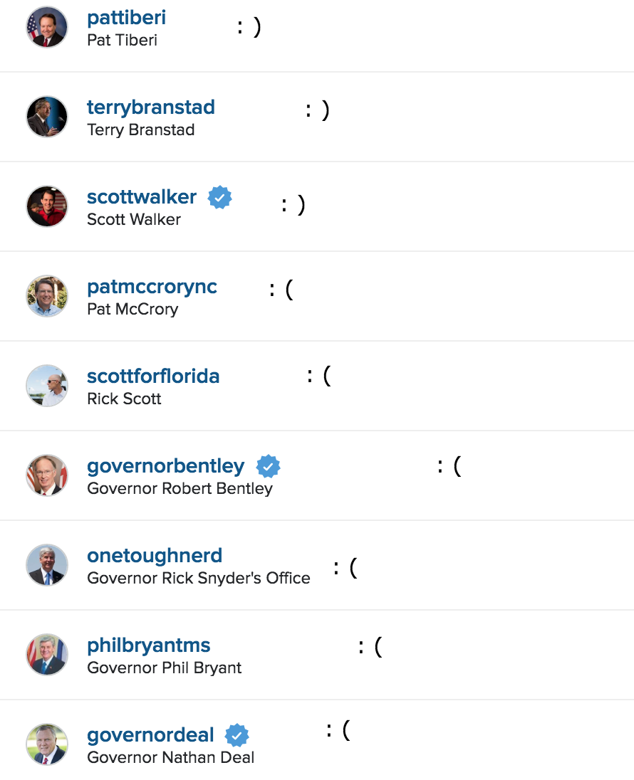 Eleven of Kasich’s fellow governors are not following him. Gov. Rick Synder of Michigan follows Paramount Coffee, the University of Michigan College Republicans, and the Grand Rapids Public Library. Gov. Nikki Haley of South Carolina follows The Huffington Post and ABP Makeup. Gov. Gary Herbert follows the Utah State University Botanical Center. Gov. Pat McCrory of North Carolina follows Chick Fil-A and the television show host Mike Rowe. Gov. Nathan Deal of Georgia follows Porsche, Mercedes-Benz, Americans for Prosperity, and the rapper Ludacris. Gov. Robert Bentley of Alabama follows the Alabama State bar and an account for a local Crossfit franchise. Gov. Bruce Rauner of Illinois follows Rock the Vote and the Smithsonian. Govs. Rick Scott of Florida and Phil Bryant of Mississippi currently follow no accounts.