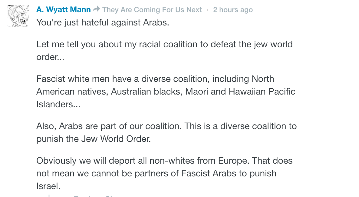 Also, Arabs are part of our coalition. This is a diverse coalition to punish the Jew World Order.