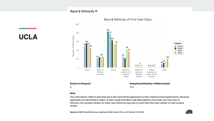 The focus on racial diversity has coincided with a dramatic shift in the racial and ethnic composition of the medical school, where the number of Asian matriculants fell by almost a third between 2019 and 2022, according to publicly available data. No other elite medical school in California saw a similar decline.
