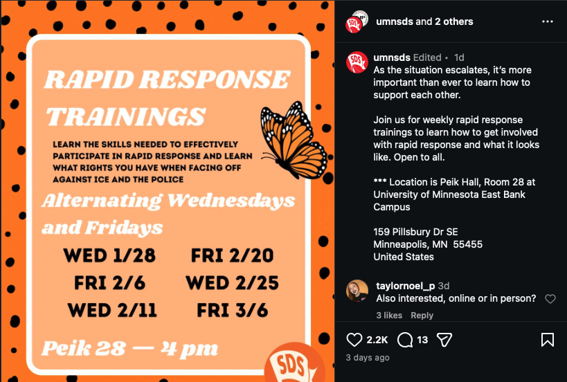UMN SDS also holds weekly "rapid response trainings" on the University of Minnesota's campus. It organizes school walkouts as well.