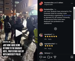 "Let's go back to the Graduate louder than ever to demand the UMN cut ties with the Graduate or they tell us the ICE agents staying there are gone," the Instagram post continued. "The UMN community needs peace of mine [sic] that murderers aren't sleeping next door. Bring the noise."