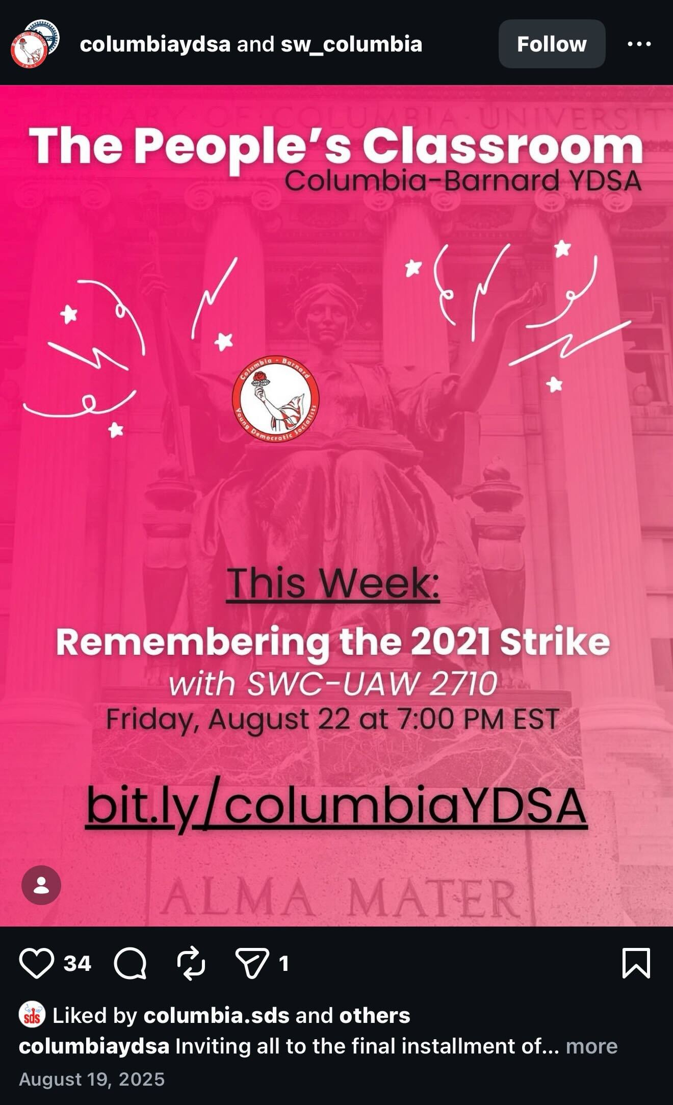 YDSA has long collaborated with CUAD online. On July 22, it co-published an Instagram post alongside the account "columbia4palestine," which CUAD has used to share footage of its illegal demonstrations after Meta banned a previous account bearing the group's name. The post condemned Columbia for suspending some 80 students arrested in a May library storming organized by CUAD and noted that a "full press release" on the matter could be found in its bio—the link, which was still available as of Friday afternoon, points to an official CUAD statement.