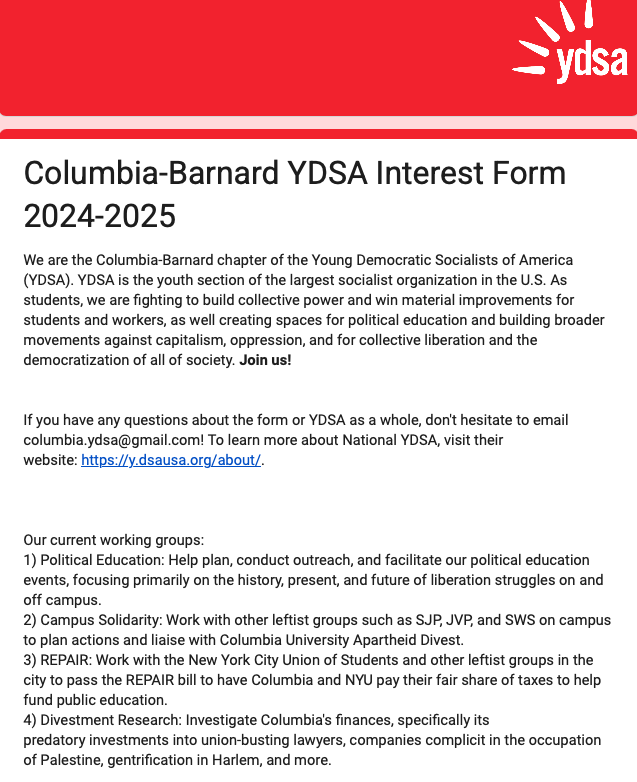 YDSA's official Columbia webpage, however, includes a link to an interest form that says the group coordinates with other banned "leftist groups"—Students for Justice in Palestine (SJP) and Jewish Voice for Peace (JVP)—to "plan actions and liaise with Columbia University Apartheid Divest." The form says it's for the 2024-2025 school year, but YDSA included a link to it in an August 19 Instagram post.