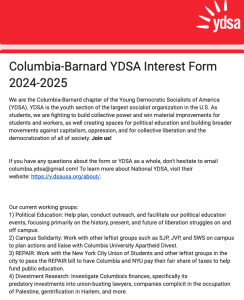 In recent months, YDSA has hosted anti-ICE trainings and organizing efforts aimed at "building socialism at Columbia." It also campaigned for New York City mayor Zohran Mamdani, a DSA member who defended the phrase "globalize the intifada."