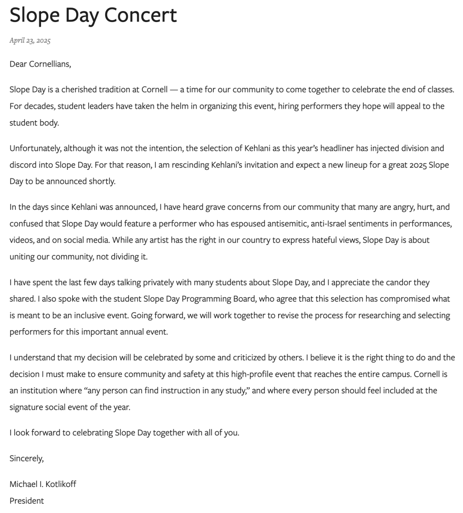"For that reason," Kotlikoff said, "I am rescinding Kehlani's invitation and expect a new lineup for a great 2025 Slope Day to be announced shortly."