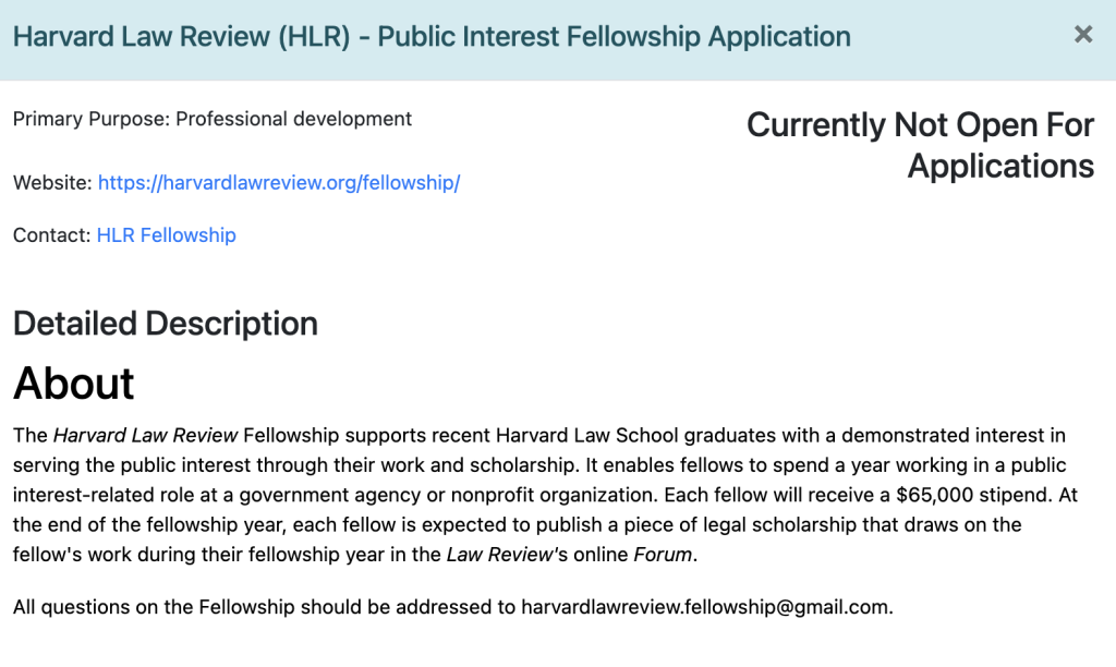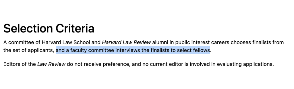 The law review claims to be separate from the law school, something a spokesman for Harvard, Jeff Neal, emphasized in a statement to the Free Beacon. The fellowship could undercut those claims. A Free Beacon review found that Harvard's database for grant and fellowship opportunities, known as CARAT, advertises the fellowship. That advertisement states that a "committee of Harvard Law School and Harvard Law Review alumni in public interest careers chooses finalists from the set of applicants, and a faculty committee interviews the finalists to select fellows." The Harvard Law Review says those faculty members are "Review alumni" who come from "various law schools," not Harvard.