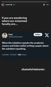 Hirsi posted another Instagram story throwing shade at university faculty who remained silent following Khalil’s arrest. She shared a post saying "the academic cowers" and added the caption, "if you are wondering where our esteemed faculty are … shameful behavior."