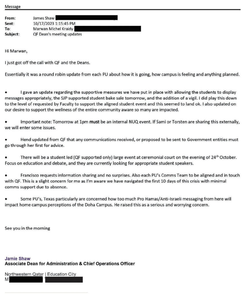 "Also each PU's [partner university's] Comms Team to be aligned and in touch with QF," Shaw continued, relaying the Qatar Foundation's demands. He went on to express "slight concern"—not about NU-Q’s alignment with the terrorist-friendly regime in Qatar, but rather that the school "navigated the first 10 days of this crisis with minimal comms support due to absence."