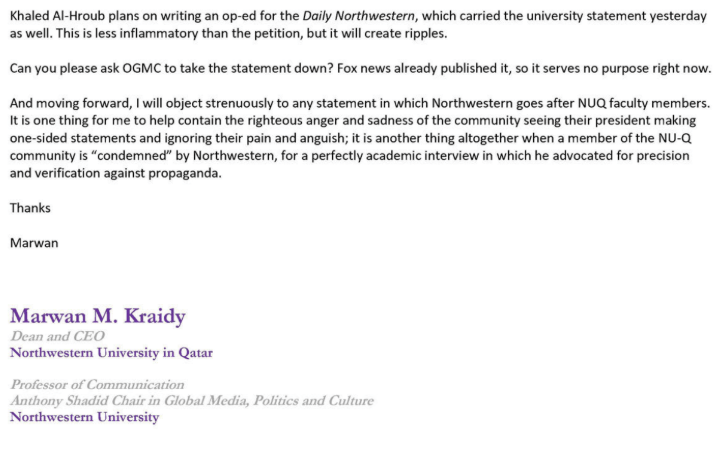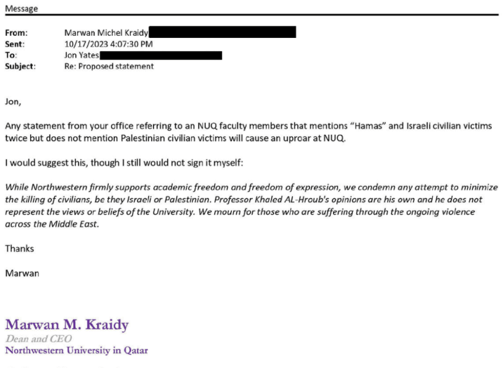 Just hours after the Qatar Foundation call, Kraidy, the NU-Q dean, refused to sign on to a statement Northwestern issued criticizing NU-Q professor Khaled Al-Hroub. In an Oct. 16, 2023, interview with an NPR affiliate in Boston, Al-Hroub said that he had not seen "any kind of credible media reporting" that Hamas terrorists had killed Israeli civilians in their beds or raped Israeli women. When Fox News contacted Northwestern for comment on the interview, the school drafted a statement condemning "Al-Hroub's attempt to minimize or misrepresent the horrific killing of Israeli civilians by Hamas on Oct. 7." Kraidy disapproved of that statement, according to emails included in the House report.