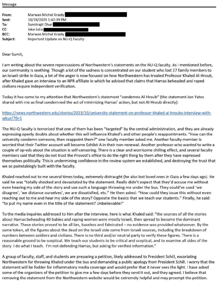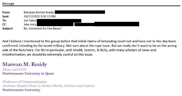 "Not sure about the rape issue," Kraidy wrote in an Oct. 17, 2023, email to Northwestern communications head Jon Yates. "But we really don't want to be on the wrong side of the facts here. For NU in particular … with many scholars of news and misinformation, we should be extremely careful on this issue."