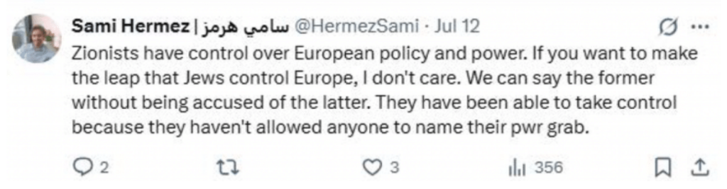"Zionists have control over European policy and power," Hermez wrote. "If you want to make the leap that Jews control Europe, I don't care. … They have been able to take control because they haven't allowed anyone to name their pwr grab."