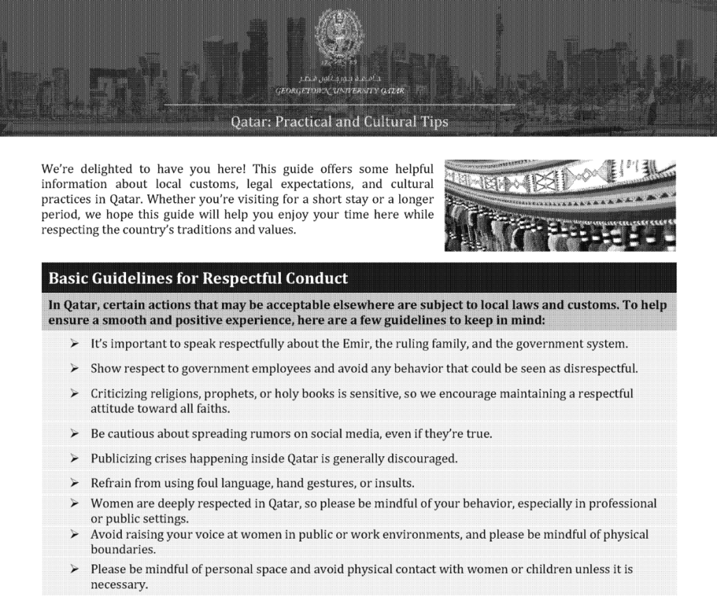 "In Qatar, certain actions that may be acceptable elsewhere are subject to local laws and customs," the guide states. It goes on to ask visitors to "speak respectfully about the emir, the ruling family, and the government system"; "be cautious about spreading rumors on social media, even if they're true"; refrain from "publicizing crises happening inside Qatar"; and avoid "criticizing religions, prophets, or holy books."