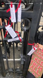The activists held signs that read "Free Our Prisoners, Free Them All," "ICE off campus," and displayed a banner with their demands. They also tied cards with the names of Palestinians killed during Israel’s war on Hamas to the gate, chanted "There is only solution, intifada revolution," "We want divestment, now, now, now," "From the river to the sea, Palestine will be Arab," and loudly banged on drums.