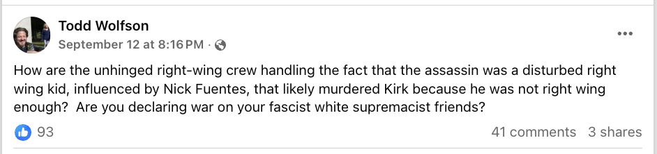 Wolfson said Robinson was likely motivated by Nick Fuentes, a far-right pundit who leads the so-called Groyper movement, echoing a baseless theory promoted by numerous liberal pundits and academics. He reposted other statements that called Robinson a "white Christian, Conservative, Republican male with a gun."