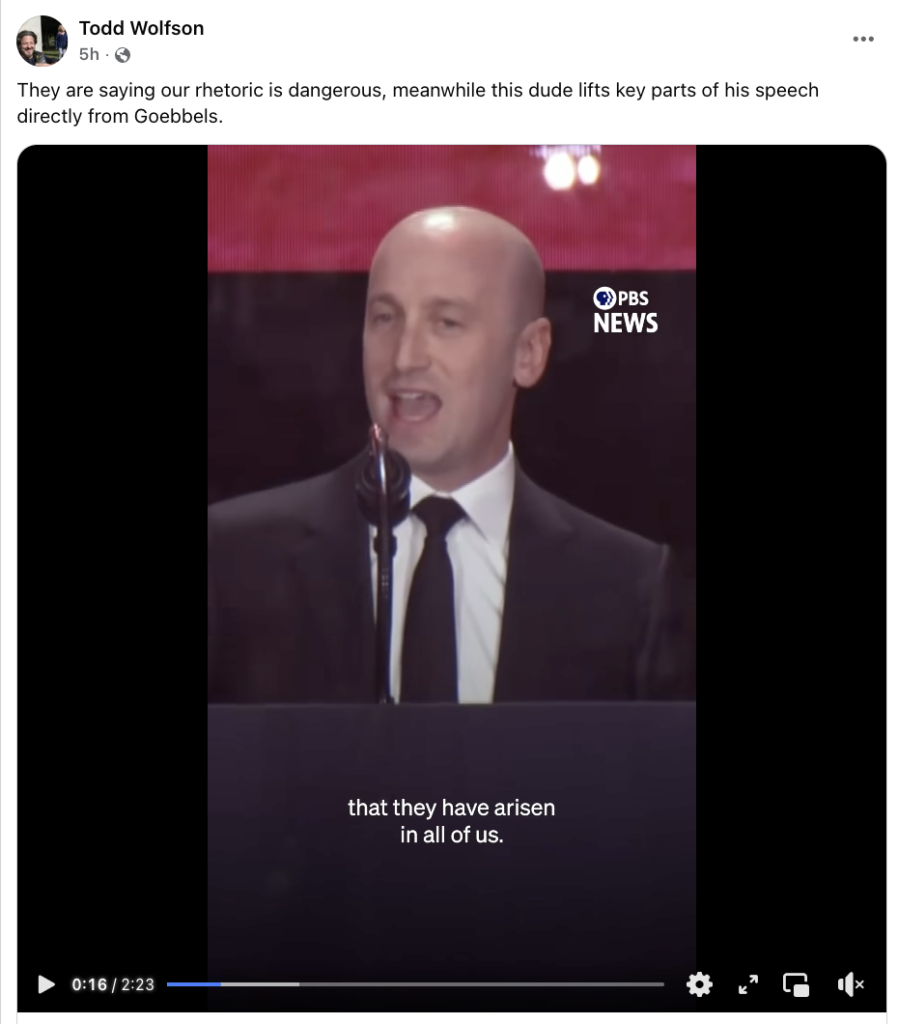 Wolfson referred to the MAGA movement in the wake of Kirk's death as "fascist," echoing the language that Robinson etched on a bullet found in the rifle he used in the Kirk murder. Wolfson stated that "Trump is the enemy," and compared Trump adviser Stephen Miller, who is Jewish, to the Nazi propagandist Joseph Goebbels after Miller spoke at Kirk's memorial service on Sunday.