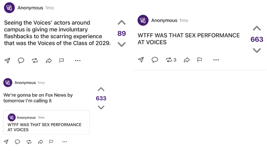 "WTFF WAS THAT SEX PERFORMANCE AT VOICES," one user posted. "Seeing the Voices’ actors around campus is giving me involuntary flashbacks to the scarring experience that was the Voices of the Class of 2029," another said.