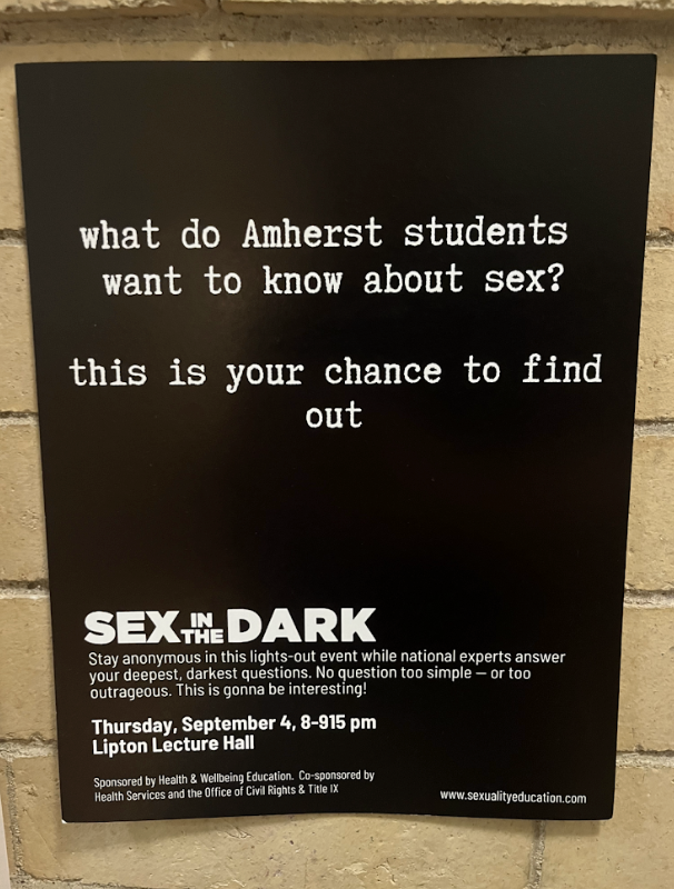 Another official event at Amherst is "Sex in the Dark," an annual program held at the beginning of each school year. Organized by the Office of Health and Wellbeing Education, the event takes place in darkness. Students report being encouraged to speak about uncomfortable sexual topics, such as their sexual orientation, habits, kinks, and fantasies with the "sex experts" in the dark room.