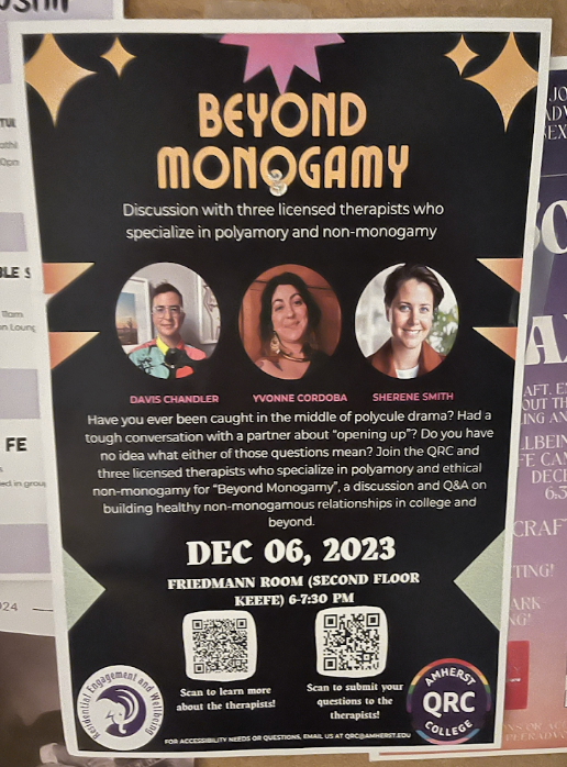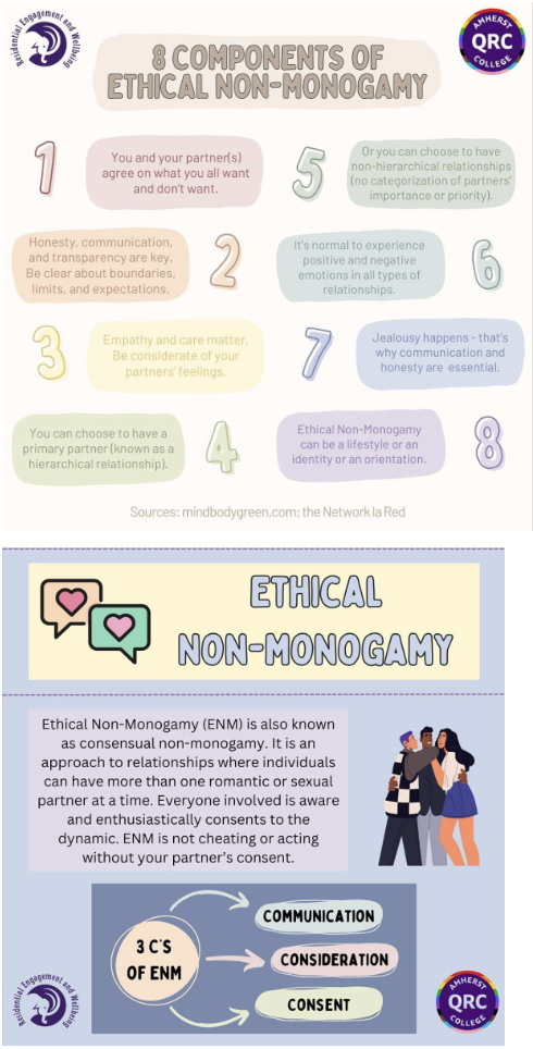 Materials promoted by the Queer Resource Center aimed to teach students different types of healthy non-monogamous relationships, listing sexual scenarios such as "open relationships," "threesomes," and "swinging," as well as newer sex concepts like "relationship anarchy," and "polyfidelity." The Amherst communication office categorized "Beyond Monogamy" as part of its sexual health education programming.