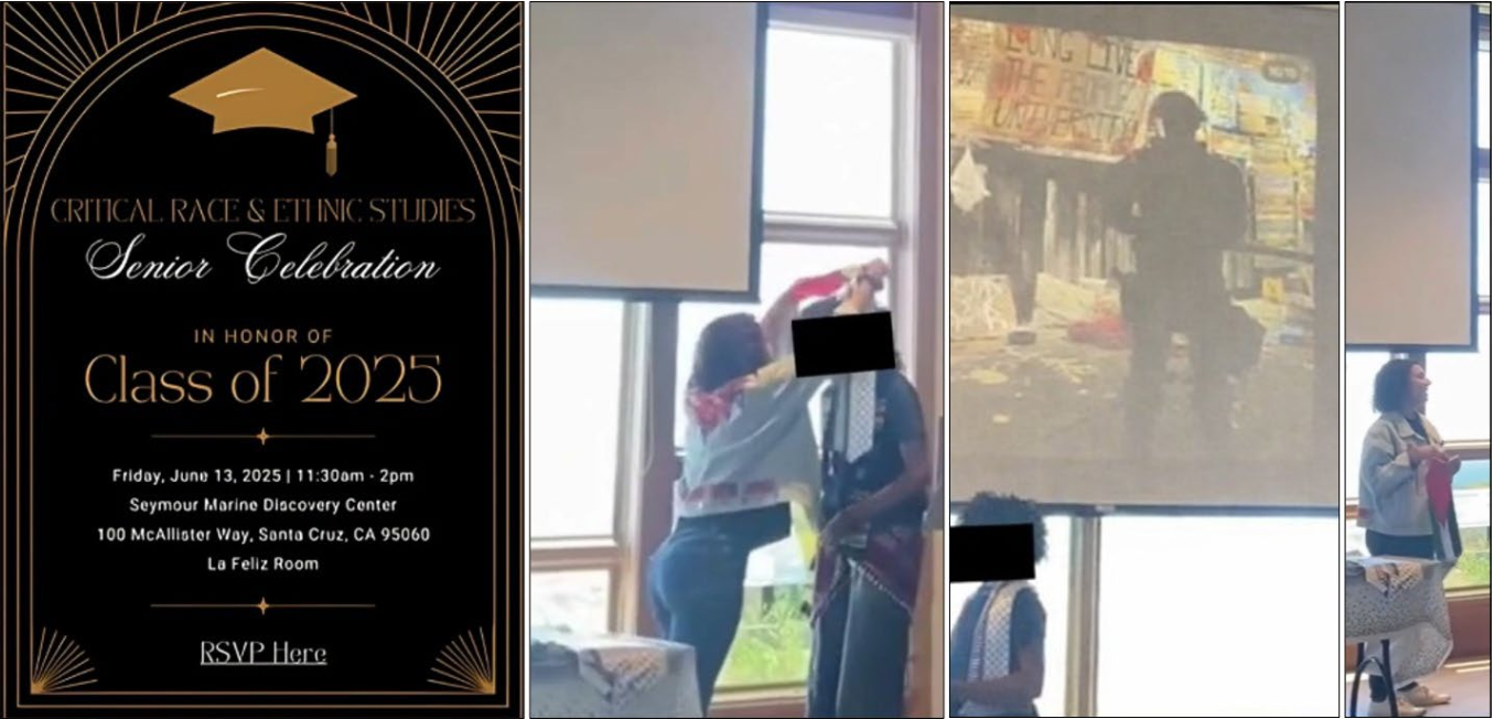The AMCHA Initiative, an anti-Semitism watchdog group, published the photos as part of a new report on the University of California system. AMCHA said the Critical Race and Ethnic Studies senior ceremony was transformed into a political spectacle that "blur[red] the line between academic operations and political demonstration, using university authority and official platforms to signal anti-Zionist activism as normative."