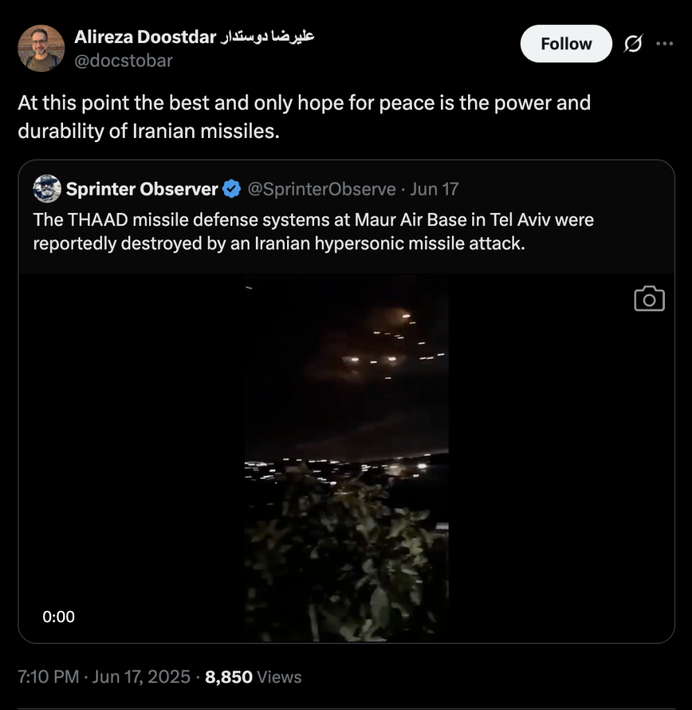 Alireza Doostdar, an associate professor of Islamic Studies and a dual U.S.-Iranian citizen, wrote in a Tuesday X post, "At this point the best and only hope for peace is the power and durability of Iranian missiles." His statement was in response to a video alleging that an "Iranian hypersonic missile attack" had destroyed an Israeli missile defense system in Tel Aviv.