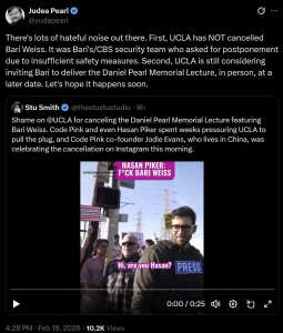 Weiss was set to deliver the annual Daniel Pearl Memorial Lecture at the UCLA Burkle Center for International Relations next week. But the event, which was expected to bring a wave of protesters, was canceled after CBS's security team "raised the issue of safety and asked for additional measures of security," a source familiar with the matter told the Washington Free Beacon. The university is "seriously considering now reinviting Weiss at a later date in person or virtually," the source added.