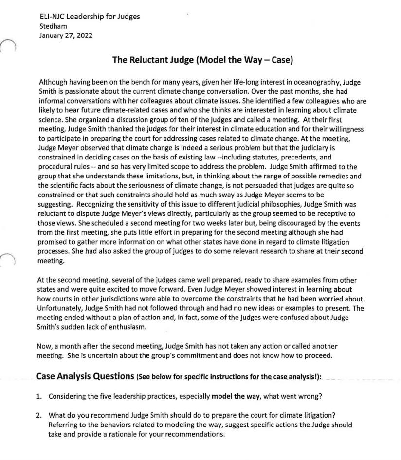 Materials for a 2022 seminar show that judges were broken into small groups, one of which was instructed to analyze a fictitious "case study" in which a judge backs away from confronting a colleague who believes that "the judiciary is constrained in deciding cases on the basis of existing law – including statues, precedents and procedural rules – and so has very limited scope to address" climate change. The judges are instructed to discuss "what went wrong."