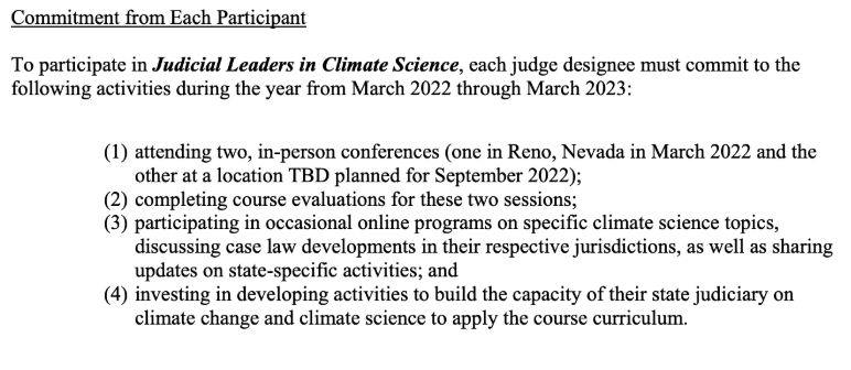 Attendance at CJP seminars come with strings attached. Judges participating in the "Judicial Leaders in Climate Science" seminar are required to make a year-long commitment to participate in CJP programming, including two in-person conferences, attend the group’s online courses, "sharing updates on state-specific activities," and take steps to "apply the course curriculum" within their state judiciaries.