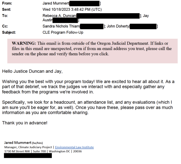 In one email, CJP Manager Jared Mummert told Oregon judge Rebecca A. Duncan that she would need to "debrief" him and send him an "attendance list" after an event she was hosting. "[A]s part of that debrief, we track the judges we interact with and especially gather any feedback from the programs we're involved in," wrote Mummert. "Specifically, we look for a headcount, an attendance list, and any evaluations (which I am sure you'll be eager for, as well). Once you have these, please pass over as much information as you are comfortable sharing."