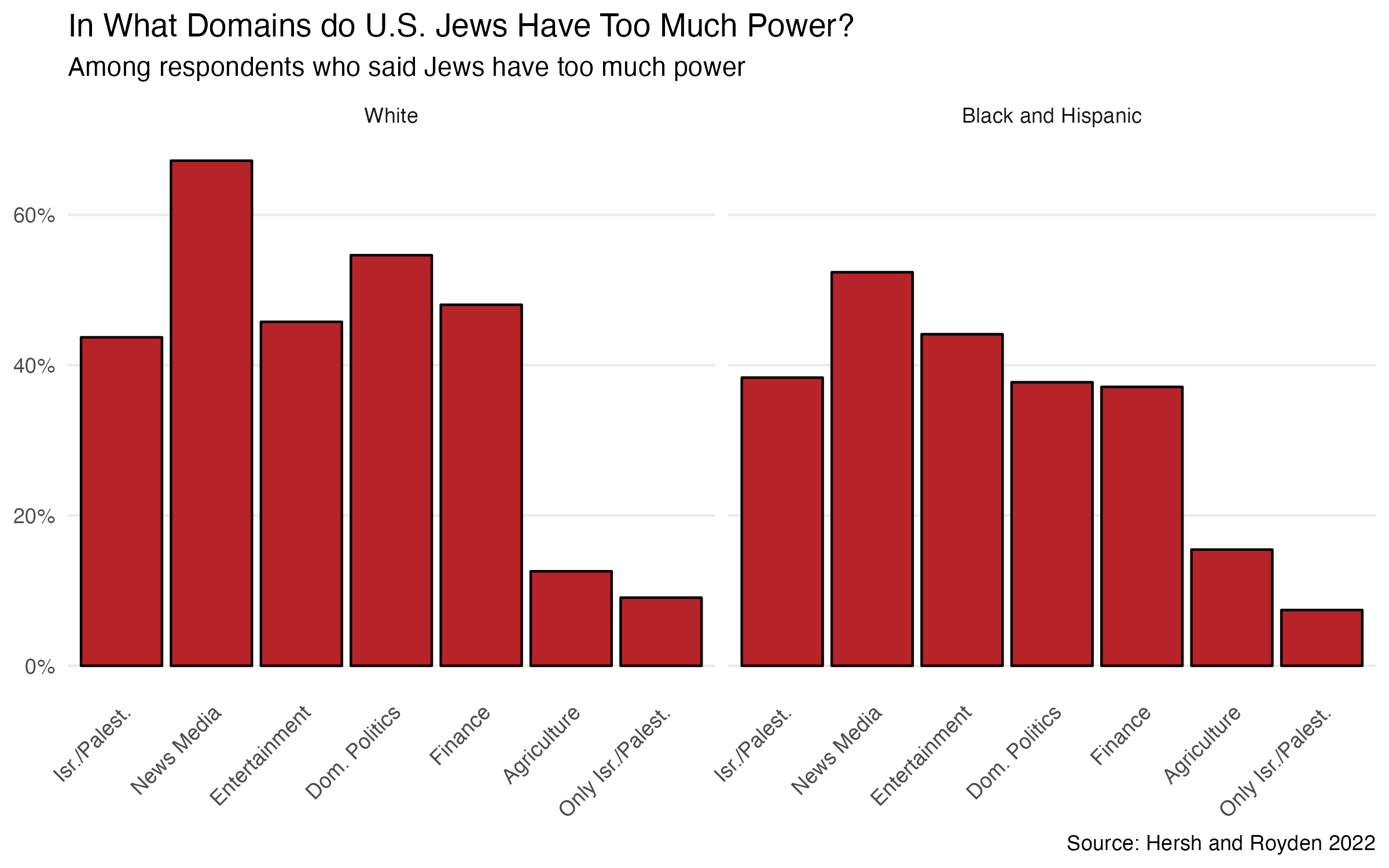 To supplement this, Hersh and Royden asked respondents who said they believed Jews had too much power in which domains they had such power. Very few respondents—7 percent of blacks/Hispanics and 9 percent of whites—selected only Israel and Palestine. Instead, these respondents said Jews had too much power in areas like news media, finance, and entertainment. This suggests that anti-Semitic bias is not driven by anti-Israel views.
