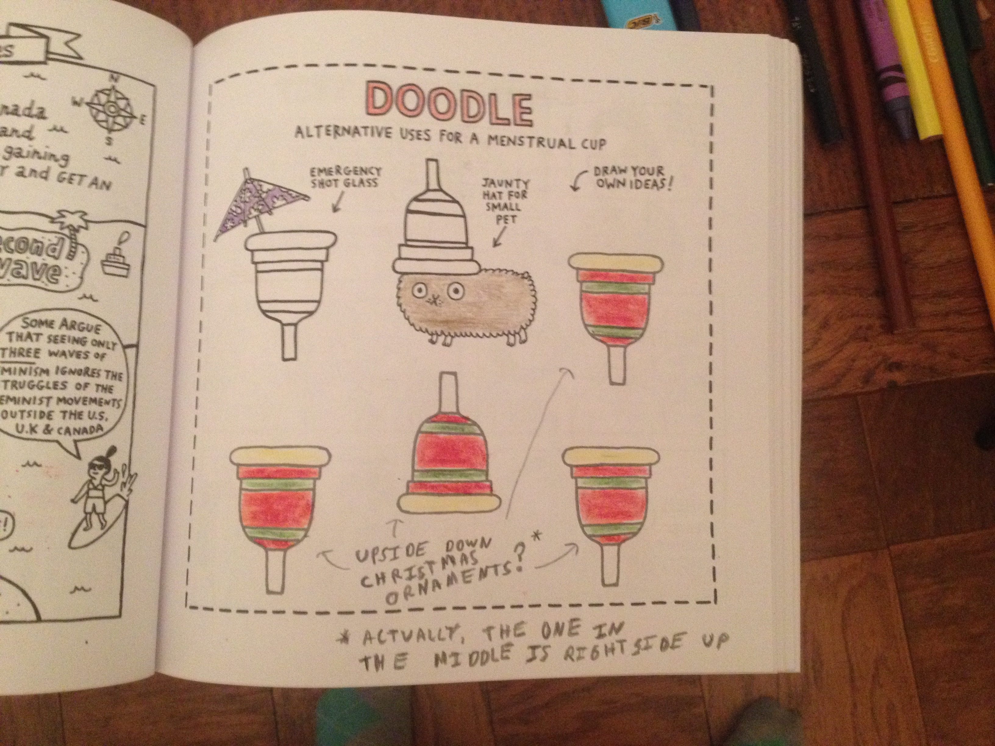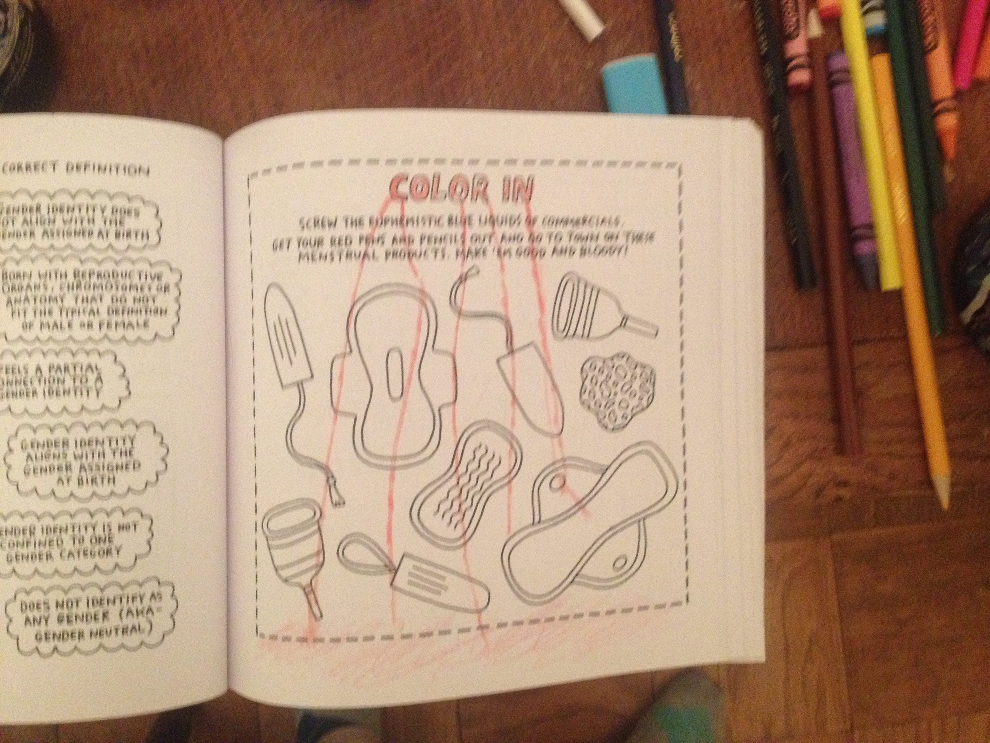 On the subject of blood: There is a lot of it in this book. On one page, the reader—user? aspiring feminist?—is invited to do what is called a "Color In": "SCREW THE EUPHEMISTIC BLUE LIQUIDS OF COMMERCIALS. GET YOUR RED PENS AND PENCILS OUT AND GO TO TOWN ON THESE MENSTRUAL PRODUCTS. MAKE ‘EM GOOD AND BLOODY!" Another activity suggests "alternative uses for a menstrual cup." I had no idea what these bizarre bell-shaped devices were, nor did my wife, but I colored them and pretended that they were Christmas ornaments.