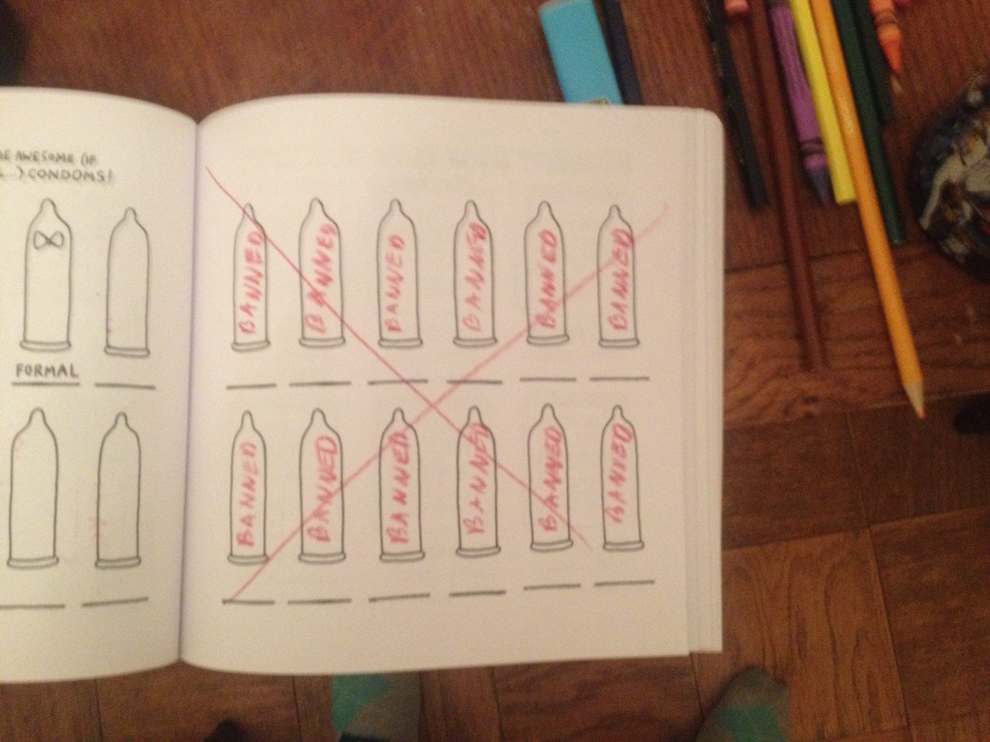 I found further use for my red crayon in the "Doodle" pages in which we are asked to "design some awesome (if impractical…) condoms!" (Examples given include "Camo," "Frilly," "Cargo," and "Formal.") I abhor contraception and could not even come up with something funny, so I wrote "BANNED" in angry letters on 12 of the prophylactics and drew a large X over them.