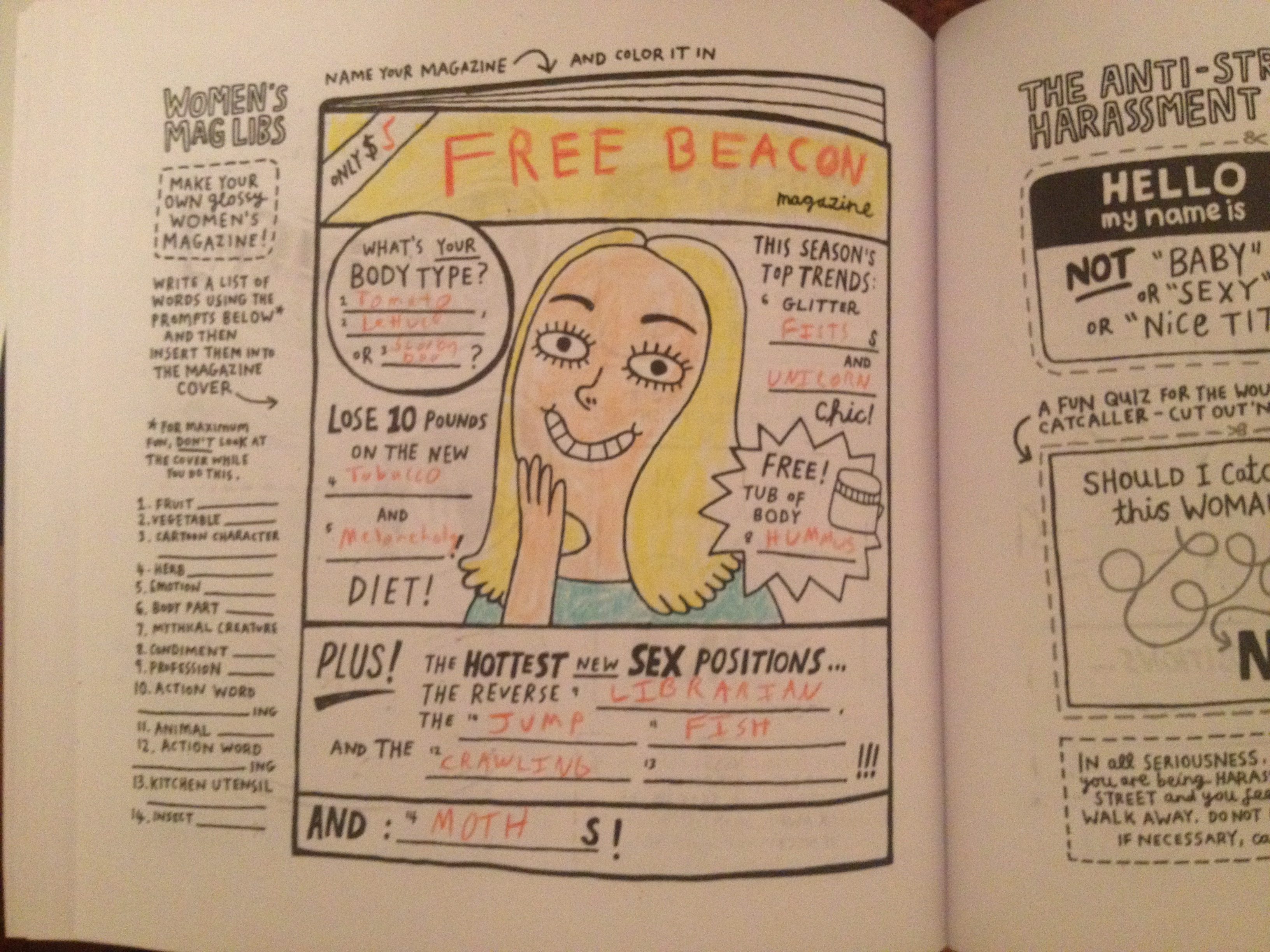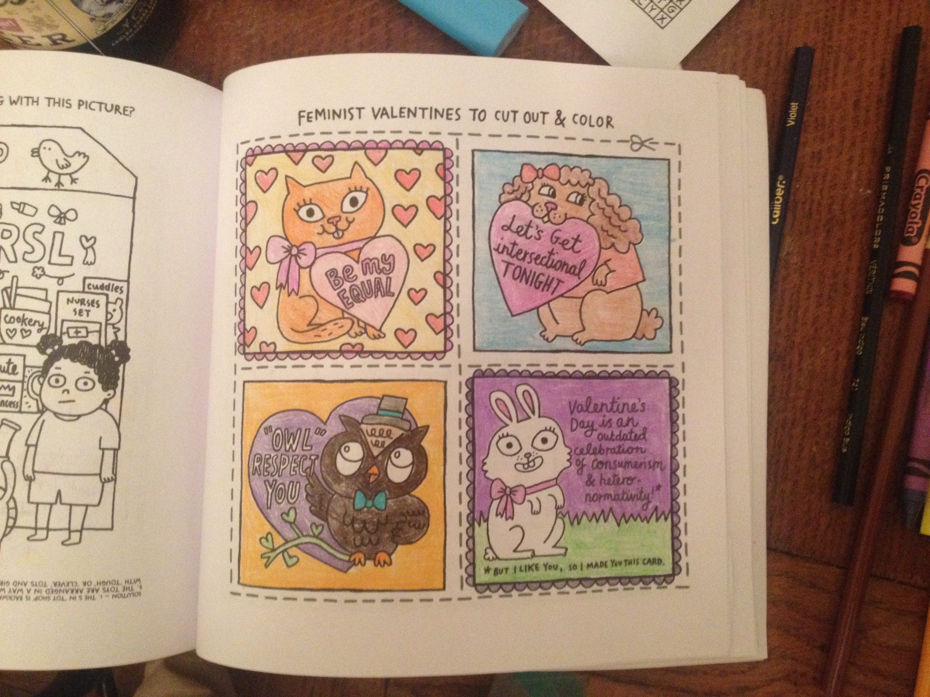 There are other, more mundane activities here. Some of these, such as the feminist valentines and the fill-in-the-blank conversation starter cards ("What do you think the age of consent should be?" "Marriage") were almost fun. I enjoyed mocking up a cover of my own women’s magazine using a Mad Libs-style format, coming up with three additional feminist marriage badges ("Great Driver!"; "BAD COOK AND PROUD"), and designing four of my own feminist t-shirts ("1-22-73"; "Feminists can run sweatshops, too!"). It was nice to recognize that many of my favorite films—from Picnic at Hanging Rock to Snow White and the Seven Dwarfs—pass the Bechdel test, which consists of noting whether a given film features two or more women talking about a subject other than a man. I added Hole’s immortal "Violet" and Loretta Lynn's "Happy Birthday" to the feminist playlist, where they stand beside "Survivor" and, weirdly, "Been a Son." I even wrote some mini reviews and assigned star ratings to things I’d read from the Feminist Book Club: I gave Mrs. Dalloway five stars, but Judith Butler’s inscrutable Gender Trouble (random sentence: "Irgaray would maintain, however, that the feminine ‘sex’ is a point of linguistic absence, the impossibility of a grammatically denoted substance, and, hence, the point of view that exposes substance as an abiding and foundational illusion of a masculinist discourse") got only one. I wish I had done a better job helping Rashida to "find her way to work without encountering any patriarchal bullshit": the first path we took led us straight to the Old Boys’ Club ("GET OUT!"). We doubled back and came almost within striking distance of the Wage Gap before turning around yet again, grinning and bearing it past the Old Boys again, until suddenly—BAM! sexual harassment. I hope she didn’t spill her coffee.