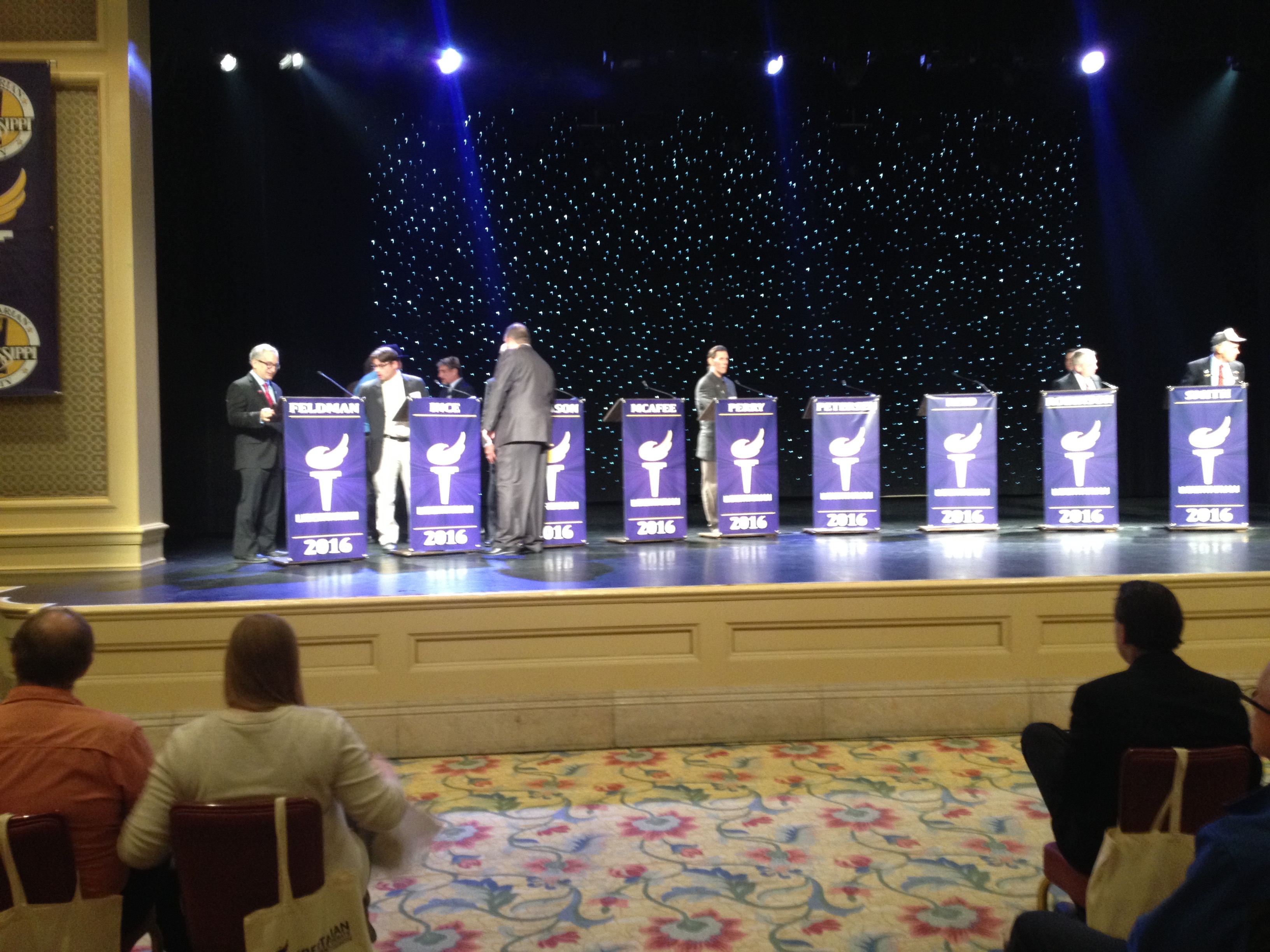 When the candidates took the stage I noticed that they were standing behind a backdrop of stars. Was this a metaphor for the infinite reaches of space into which we shall penetrate when we free ourselves from the shackles of government and enter, fire-imbibed, into the heavenly sanctuary—or, in reverse, the mere stardust fragments of authoritarianism that will remain after we all explode in a supernova of liberty?